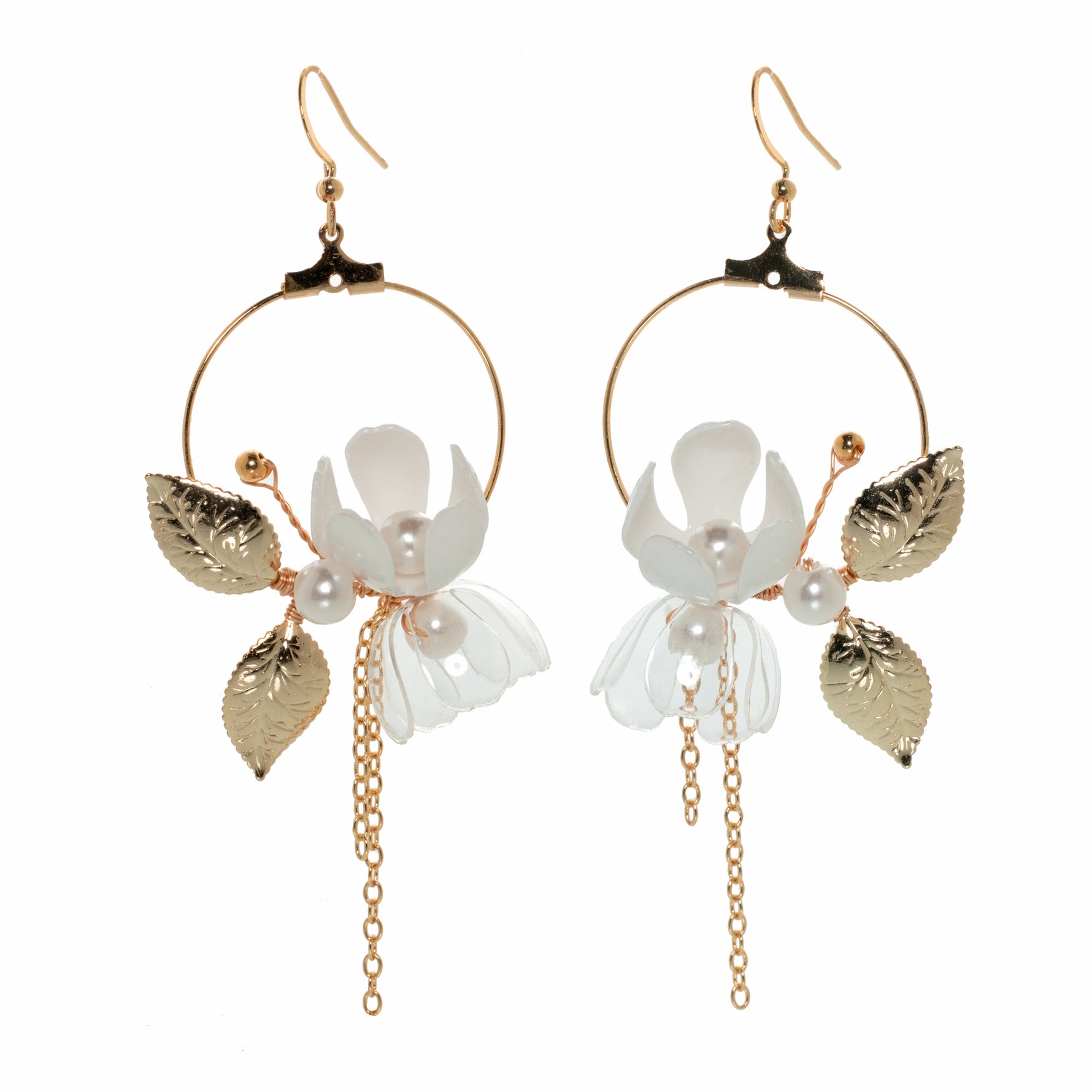 Delicate floral blooms make these White Floral Moon Earrings a dainty and feminine choice for any day or nighttime apparel with a white hue that works well with any attire. Look your best with the elegance and sophistication of the White Floral Ring Earrings in your ears.